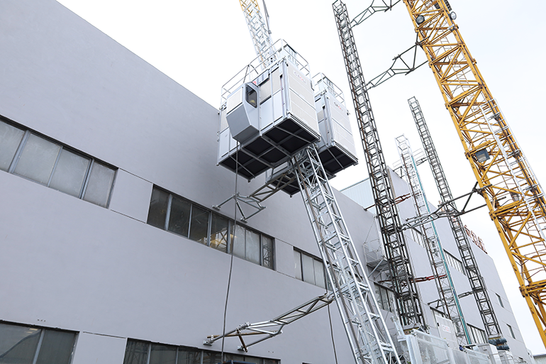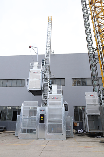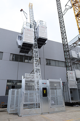 升降机斜梯通常指的是与水平面成一定倾斜角度安装的升降设备中的梯子部分,或是专门设计的倾斜式升降梯。1.额定载重量:2*2000 kg2.提升速度:0-63m/min3.最大架设高度:450m4.最大倾斜角度:13°5.电机功率:2*3*11kw6.防坠安全器型号:SAJ50-1.47.标准节尺寸:650x650x15088.吊笼标准尺寸:3.2x1.5x2.4m