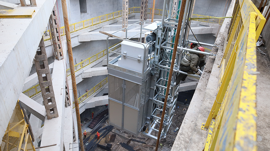 组合式升降机重量轻,模块化拼装,安装、施工、拆除、移场简单快捷,可有效地缩短施工工期。该组合式升降机和现有技术相比,具有设计合理、结构简单、易于加工、体积小运输、操作方便等特点,能很好地满足建筑装饰施工的需要。可复原成常规尺寸升降机使用。承载力强,结构刚柔结合,抗冲击力较强,施工安全性好。组合式升降机地基处理费用低,互换性高,通用性强,综合成本低。具有较为明显的经济性优势。